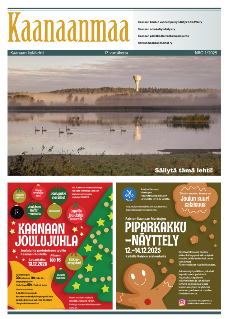 Kaanaassa toimivat yhdistykset ovat yhteisvoimin julkaisseet vuosittain syksyllä ilmestyvää Kaanaanmaa -lehteä. Lehti on ilmestynyt jo vuodesta 2009 lähtien. Alla vanhat lehdet, joista voit lukea historiatietoa Kaanaasta. Lehti on tehty talkootyönä ja painotyö on rahoitettu ilmoitustuloilla, joista lämmin kiitos paikallisille yrittäjille. Lehti on jaettu kaikkiin talouksiin Kaanaan alueelle. Painosmäärä noin 1100 kpl.